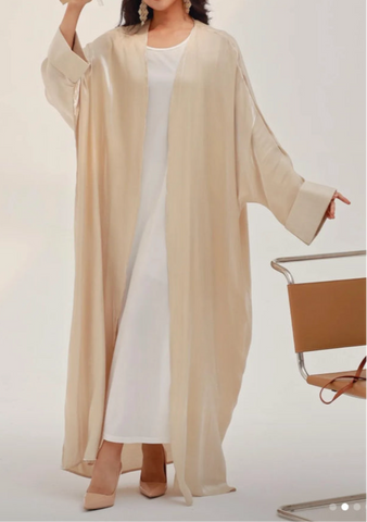 Lovely shimmering beige open abaya made of lightweight machine washable polyester.