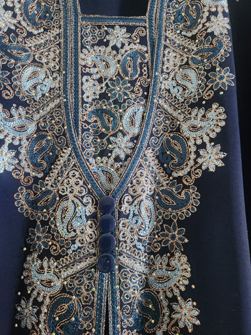 Approximately M/L size (42" bust / 54" length). Medium weight polyester is great for various weather. Layered look abaya haa gorgeous metallic thread embroidery. This is a special occasion dress from Medina.