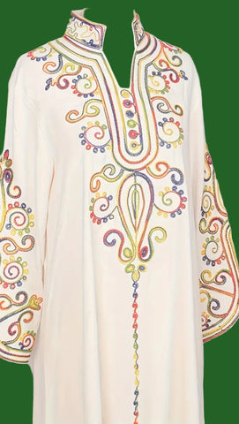 Approximately size 12/Lg (42" bust / 56" length). The polyester is lightweight and perfect for warmer weather. The multi-colored rope embroidery is beautiful!